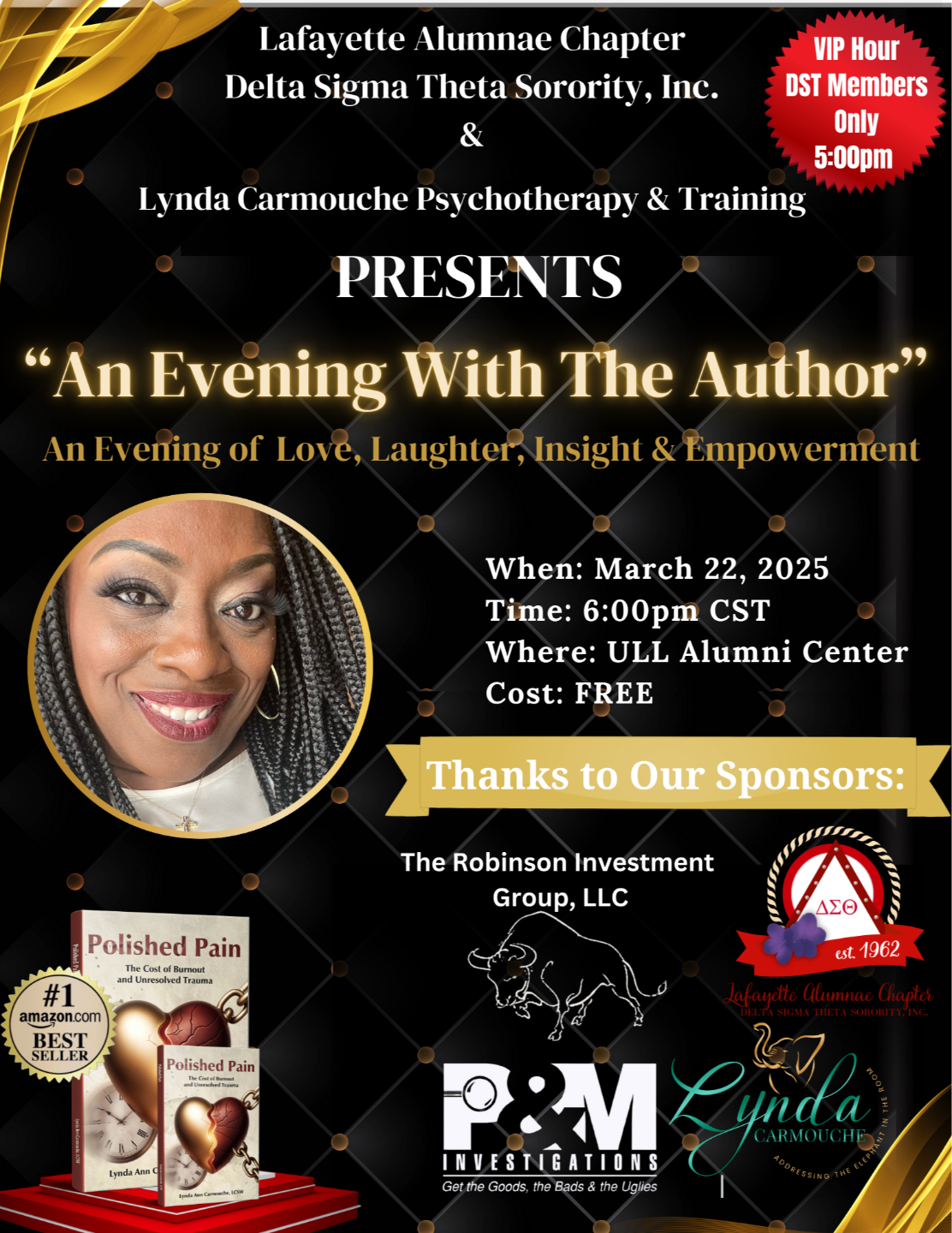 Join us for an unforgettable evening with Powerhouse Lynda Carmouche, best-selling author, therapist, and speaker, as she takes us beyond the pages of Polished Pain: The Cost of Burnout and Unresolved Trauma.